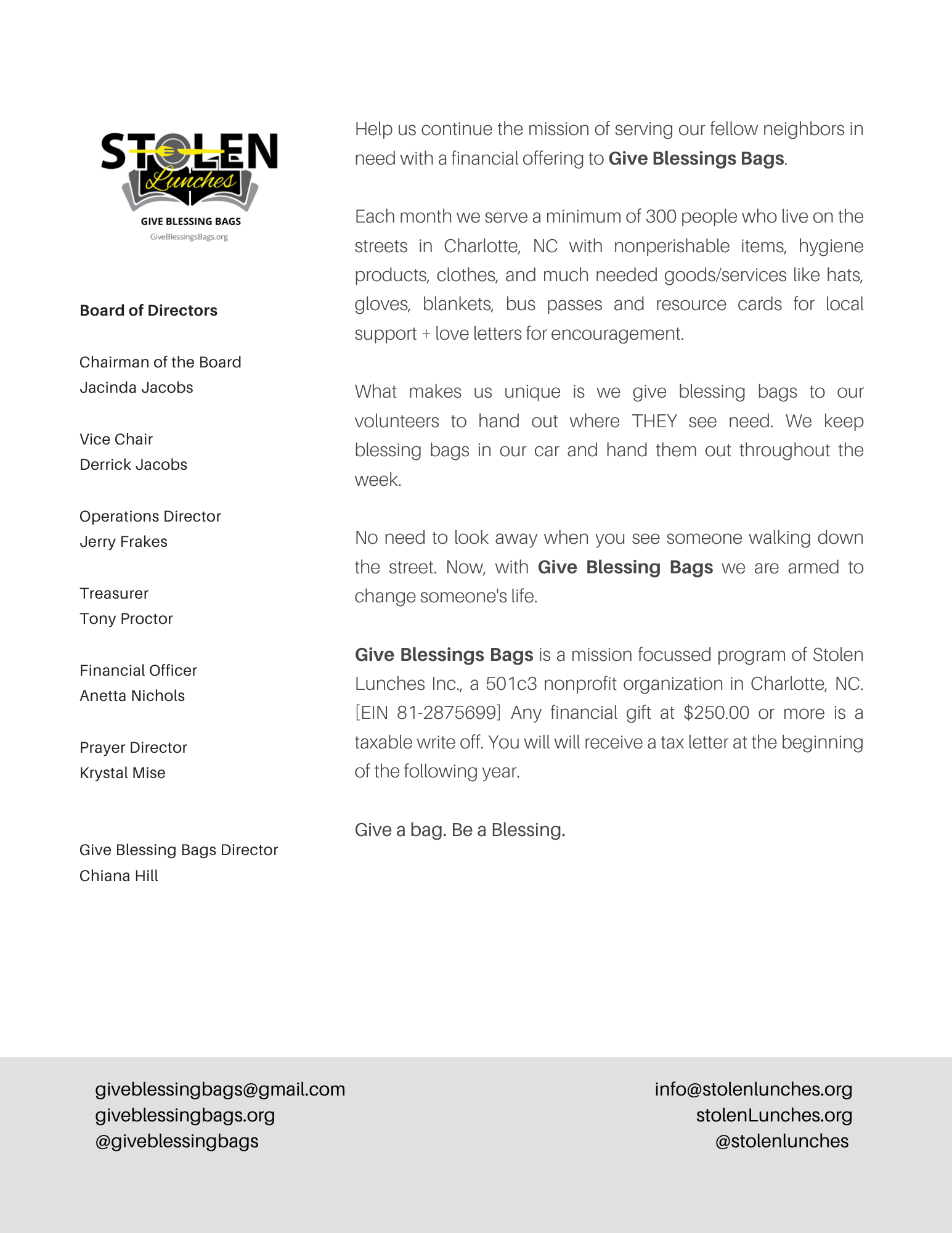 Become a Sponsor: Help us raise funds or help by providing the tangible donations we need to fill each blessing bag. Donate or email us for next steps to mail an official check. Deadline 8/28.